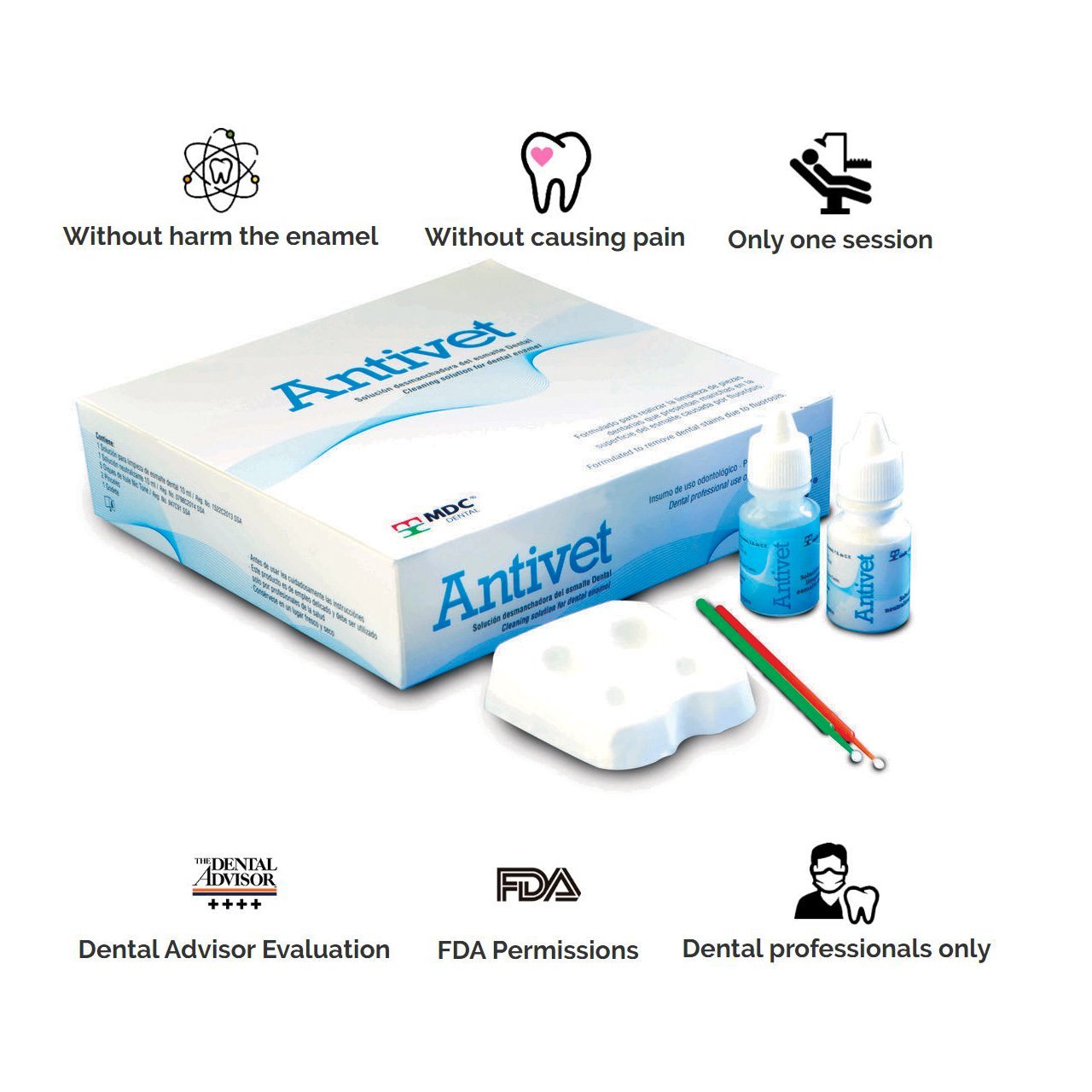 MDC Antivet Bleaching Kit Tooth Stain Remover Antivet kit is a one-visit treatment for the removal of brown stains caused by fluorosis and extrinsic stains caused by tobacco smoking. The low-pH solution helps to separate the fluoride ions out of the fluorotic area. Following treatment with the enamel cleaning solution, a neutralizing solution is applied…