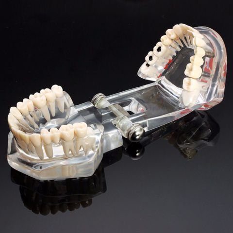 Dental Study Model With Pathology And Half Implant Display a variety of dental diseases,including:dental cries,wedqe-shaped defects,fusion roots,periapical,periapical cysts,abnomal central susp,enamel beads,qinqival recession,root exception,crown fracture,apical abscess,apical granulomawollen,impacted teeth,retained deciduous teeth ,etc. FEATURES :- Transaparent structure. High quality material. Brand new. For dental lab using. For dentist studying and researching. For Educating Patient. CONTENTS :- 1 Set.