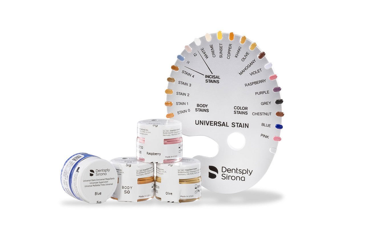 Dentsply Sirona Universal Body Stain paste materials for individual characterization with the achievement of high aesthetics. A complex system of a spectrum of color options to finalize aesthetic restorations.