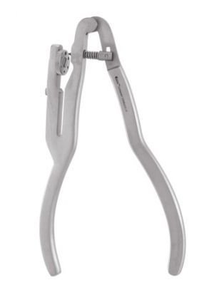 Used to anchor a rubber dam down to the cervical region of an exposed tooth. This device comes in a variety of shapes, sizes, and designs for various situations. It is typically made of spring metal and has bevelled jaws that contact the tooth, and a bow that connects the jaws. Flat and large jaws for lower premolars
