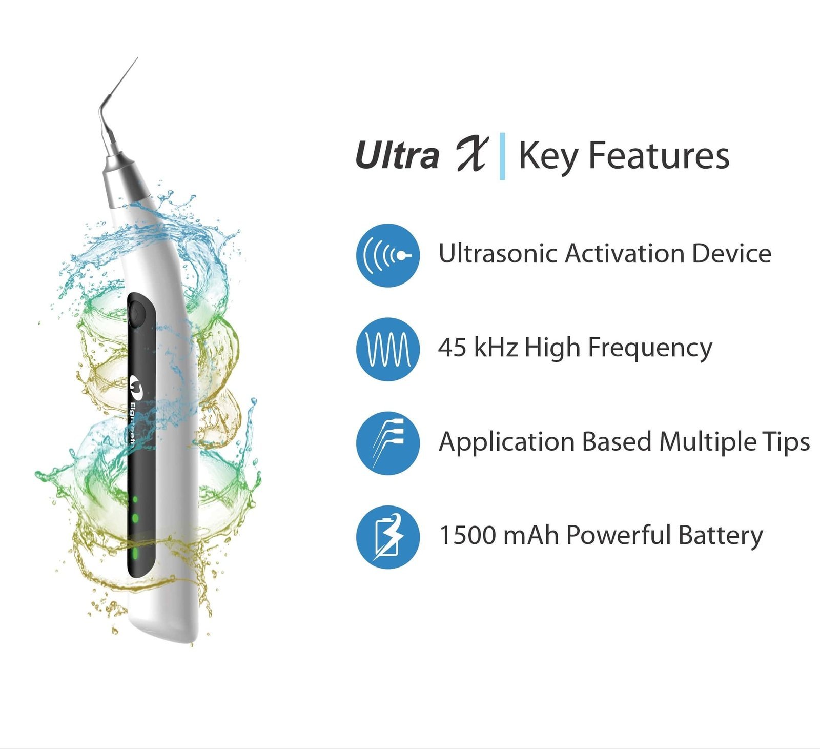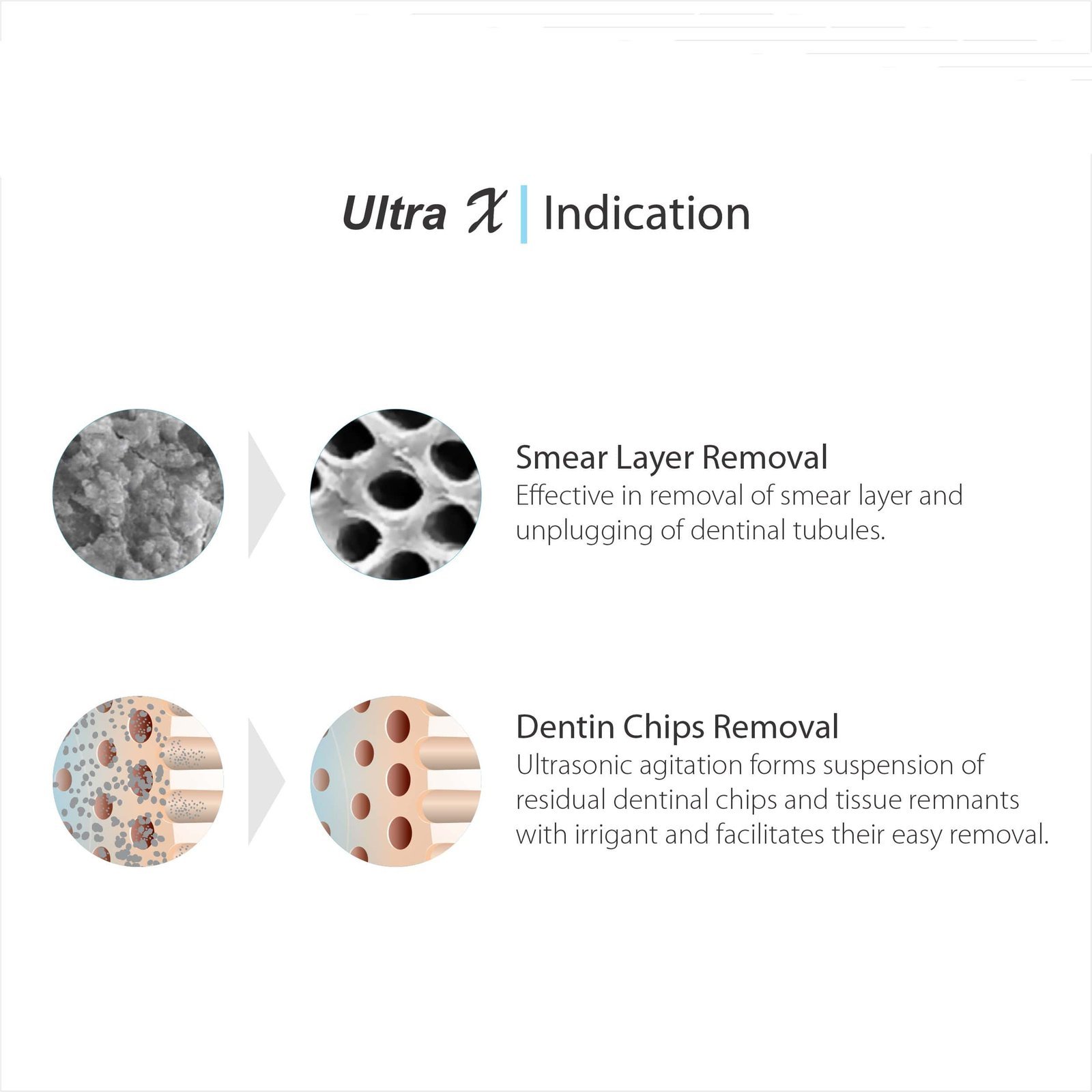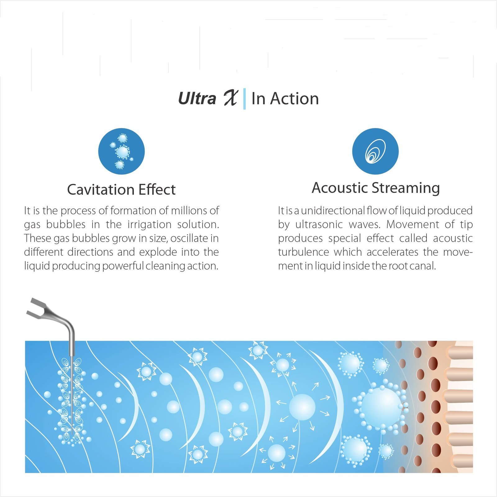 Orikam Ultra X works at 45,000 kHz ultrasonic frequencies which utilize the principle of acoustic microstreaming, agitation and cavitation to reach difficult to instrument areas (≥35%) of the complex root canal system. It can be applied endodontically to