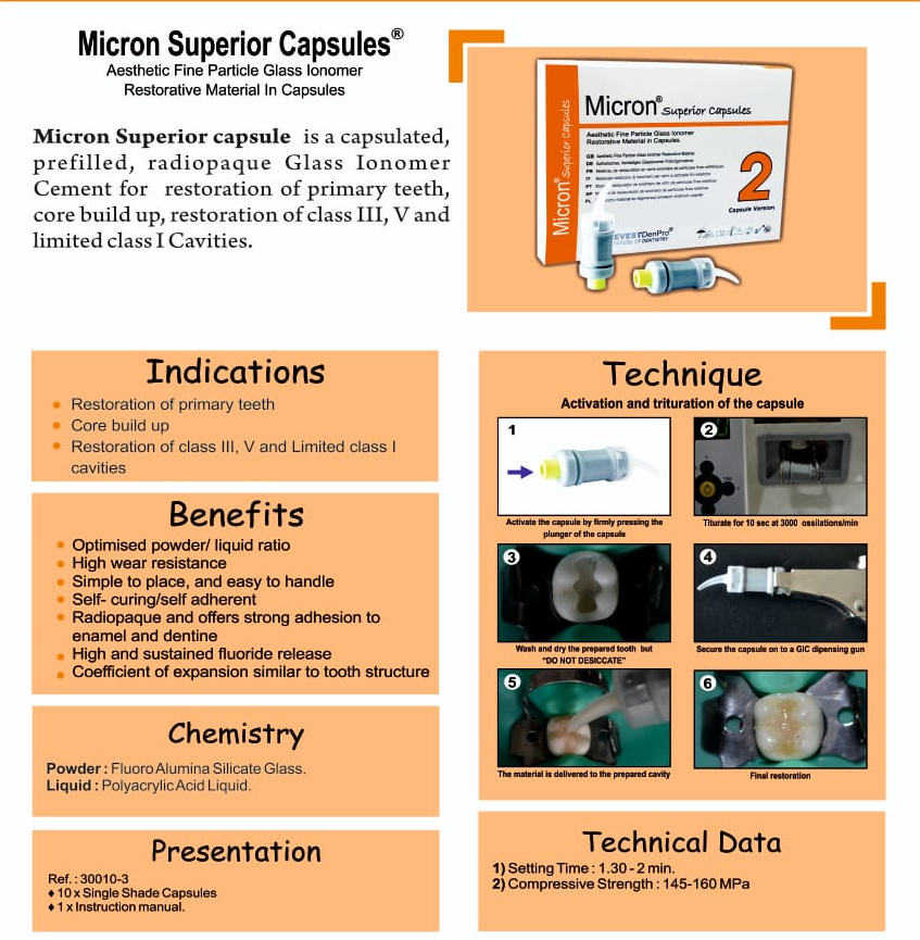 Micron Superior Capsule is a capsulated, prefilled, radiopaque Glass Ionomer Cement for restoration of primary teeth, core build up, restoration of class III, V and limited class I Cavities