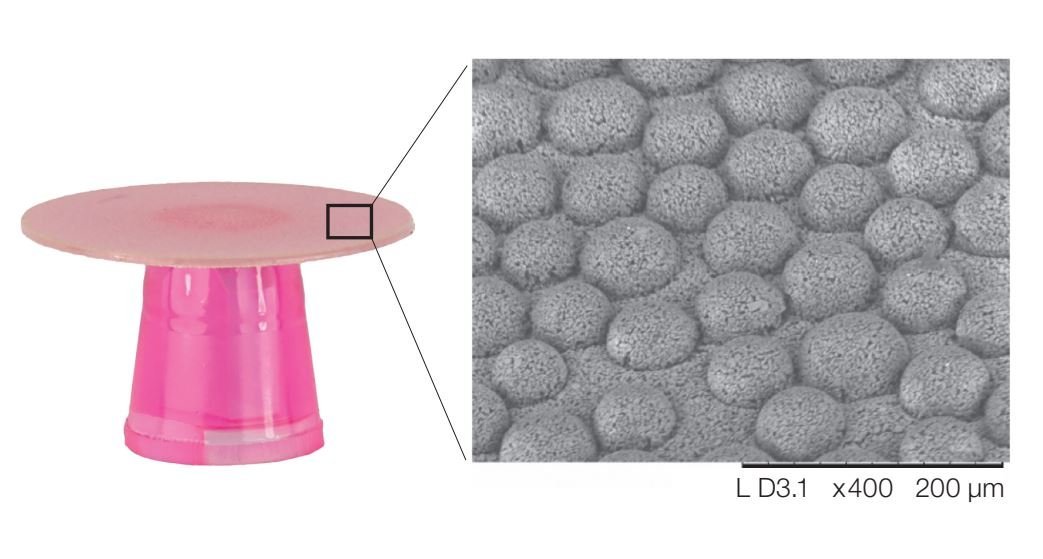 - Semi-spherical surface structure of the red disks enables debris discharge to prevent clogging and secondary scratches.