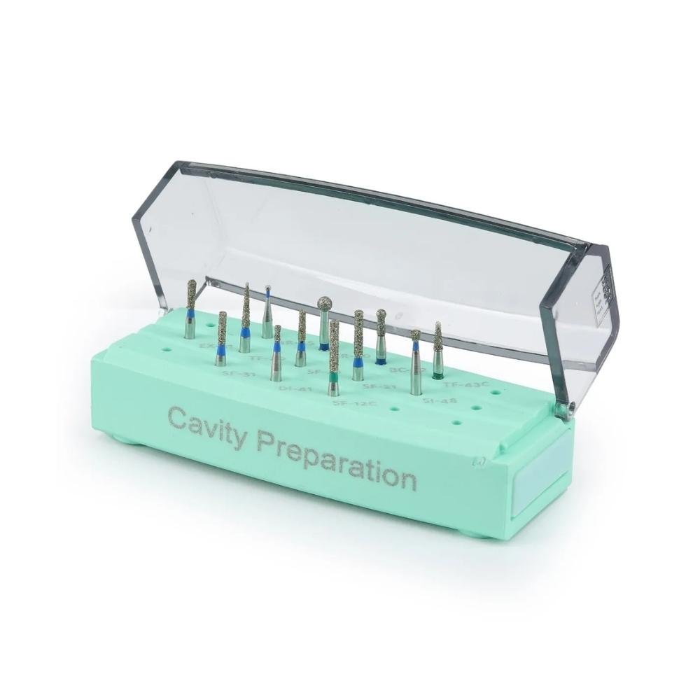 The set includes complete range of diamond burs of different shapes suited for cavity preparation to receive restorative material.